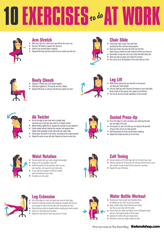Working in an office or working from home can be rough on the body. You’re not being very active due to sitting at a desk all day. The chart above are ways to get a workout in without leaving your work area.